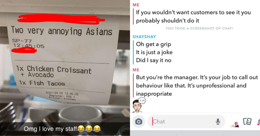 Follow us on Telegram for the latest updates: https://t.me/mothershipsg A cafe owner in Brisbane, Australia, has been criticised after he shared a photo on Snapchat praising his staff who had printed a receipt that said “Two very annoying Asians”, to describe a pair of customers. The man was initially defensive when others confronted him about his actions, but eventually released a public apology to media. Posted photo of receipt on Snapchat Shay Hayston, who is the owner and manager of Froth on Brunswick in Brisbane, reportedly posted the photo of the receipt onto Snapchat, together with the caption “Omg I love my staff”, followed by three laugh-crying emojis. Photo via Instagram / alex_carthos. Yahoo reported that a Brisbane local, Alec Madara, came across the Snapchat story and began to engage with Hayston about why he felt that his actions were inappropriate. In an Instagram post on Apr. 2, Madara shared screenshots of his purported Snapchat conversation with Hayston, in which Hayston told him that it was “just a joke” and to “get a grip”. Madara replied that as the manager, it is Hayston’s job to call out that type of behaviour. “It’s unprofessional and inappropriate,” he added. Photo via Instagram /…