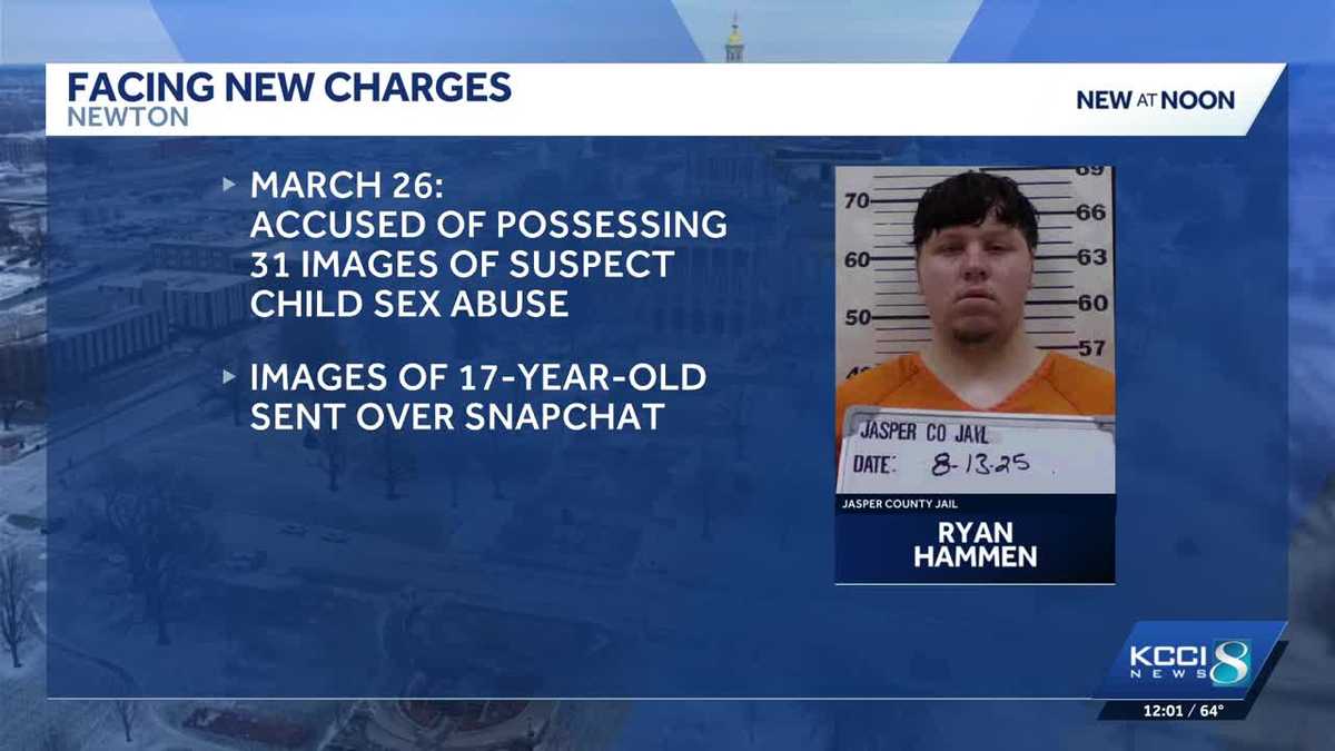 Newton man faces new charges for possession of child sex abuse images OF THE FORECAST HERE, COMING UP IN A LITTLE BIT. LAURA NEW AT NOON. A NEWTON MAN WAITING TO BE SENTENCED AFTER A GROOMING STING IS FACING NEW CHARGES. 21 YEAR OLD RYAN HAMMOND IS NOW ACCUSED OF POSSESSING MORE THAN 30 IMAGES OF SUSPECTED CHILD SEX ABUSE. THE CRIMINAL COMPLAINT SAYS ON MARCH 26TH, A FAMILY MEMBER FOUND THE IMAGES ON HIS PHONE AND REPORTED IT TO POLICE. INVESTIGATORS SAY THAT 17 YEAR OLD FEATURED IN THAT MATERIAL ADMITTED TO SENDING THE IMAGES TO HAMMOND OVER SNAPCHAT AFTER HE ASKED FOR THEM. KCCI TOLD YOU HE WAS ARRESTED JUST DAYS EARLIER AFTER ADMITTING TO POLICE HE HAD SEXUALLY ABUSED A TEENAGE VICTIM AND BEFORE THAT, IN FEBRUARY, HAMMOND PLEADED GUILTY TO ATTEMPTING TO MEET A TEENAGE GIRL FOR SEX. Newton man faces new charges for possession of child sex abuse images Updated: 12:14 PM CDT Apr 8, 2026 Editorial Standards ⓘ A central Iowa man waiting to be sentenced after a grooming sting is facing new charges.Ryan Hammen, 21, of Newton, is now accused of possessing more than 30 images of suspected child sex abuse.A criminal complaint