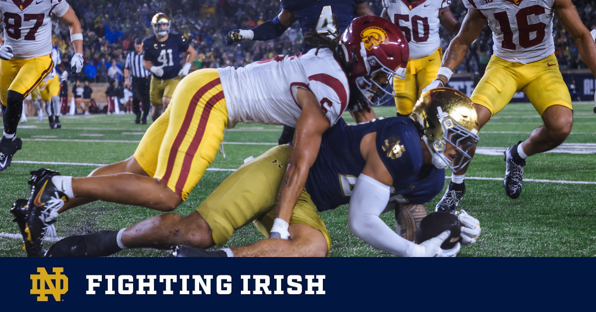The 13th-ranked University of Notre Dame football team (5-2), powered by its offensive line and dynamic running back duo of Jeremiyah Love and Jadarian Price, defeated No. 20 Southern Cal (5-2) 34-24 in a rain-soaked but jubilant sold-out Notre Dame Stadium on Saturday night.  Love rushed for a career-best 228 yards and a touchdown, posting the 18th 200-yard rushing effort in program history. Price added 87 yards, a rushing touchdown and a scintillating 100-yard kick return to seize momentum late in the third quarter.  The offense was not the lone team highlight. The defense forced three turnovers in the second half, perhaps none bigger than captain Adon Shuler’s forced fumble in the fourth quarter, recovered by Kyngstonn Viliamu-Asa. Shuler led the team with 10 tackles. HOW IT HAPPENED Southern Cal drove the length of the field quickly on their first possession after receiving the opening kickoff. Two first down passes moved the Trojans across the 50 followed by a 24-yard reception into the red zone. The touchdown came on a toe-tapping reception by tight end Lake McRee in the back corner of the end zone.  The Irish answered just as quickly. Love burst through a huge hole on the left