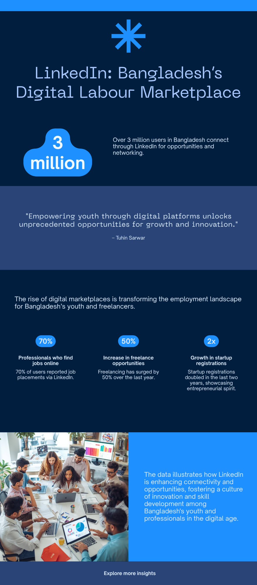 By Tuhin Sarwar | Dhaka । 06 November। 2025। LinkedIn is transforming Bangladesh’s youth and startups through professional networking, skill certification and digital entrepreneurship reshaping the future of work In the quiet rhythm of Sylhet’s cafés and Rajshahi’s co-working hubs, Bangladesh’s freelancers are building a new economy—one connection at a time. Through LinkedIn Bangladesh, thousands of young professionals are redefining what it means to work, learn, and thrive in the digital era INFORMATION LAYER Data, Context, and Digital Shift Active LinkedIn users: 5.2 million (Statista 2024) Freelance earnings growth: +31 % year-on-year (Payoneer 2024) SME founders active on LinkedIn: 70 % (LightCastle Partners 2024) | Indicator | 2022 | 2025 | Change | | ———————— | —— | —— | —— | | LinkedIn Users | 3.6 M | 5.2 M | +43 % | | Freelance Earnings (USD) | $412 M | $540 M | +31 % | | SME Founders on LinkedIn | 41 % | 70 % | +29 % | According to BASIS Bangladesh, visibility on LinkedIn correlates with 2.5 times higher funding success for early-stage startups. This digital shift has turned professional networking into an economic driver—where skills, credentials, and connections merge into measurable growth
