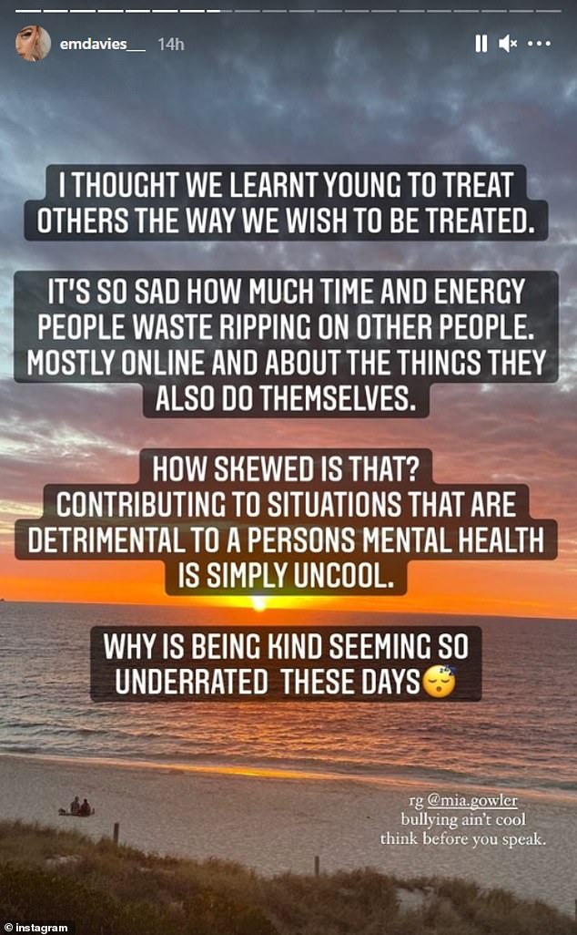 Perth influencer Em Davies lands in hot water after an accidental Snapchat video boasting about ‘doing lines all weekend’ goes viralBy Nicole Douglas For Daily Mail Australia Published: 23:56 EST, 1 March 2021 | Updated: 00:01 EST, 2 March 2021 Instagram influencer Em Davies has landed in hot water, after an old Snapchat post she accidentally shared resurfaced and went viral this week.The Perth model, 26, had boasted of ‘doing lines all weekend’ in the original post, which was re-shared on Monday by popular Instagram account Celeb Spellcheck.Alongside a bizarre picture of herself using a face-altering filter, Davies had written: ‘Sickkkk don’t have my ID on me coz I did lines w it all weekend. ‘Did lines all weekend’: Instagram influencer Em Davies has landed in hot water, after an old Snapchat post she accidentally shared resurfaced and went viral this week ‘Now can’t get on my flight bc it links to an international so have to wait four hours to get another one :).’Daily Mail Australia is not suggesting Davies was referring to anything illegal.While she is yet to respond to Celeb Spellcheck’s post, Davies later shared a cryptic quote on Instagram in which she alluded to being criticised online.…