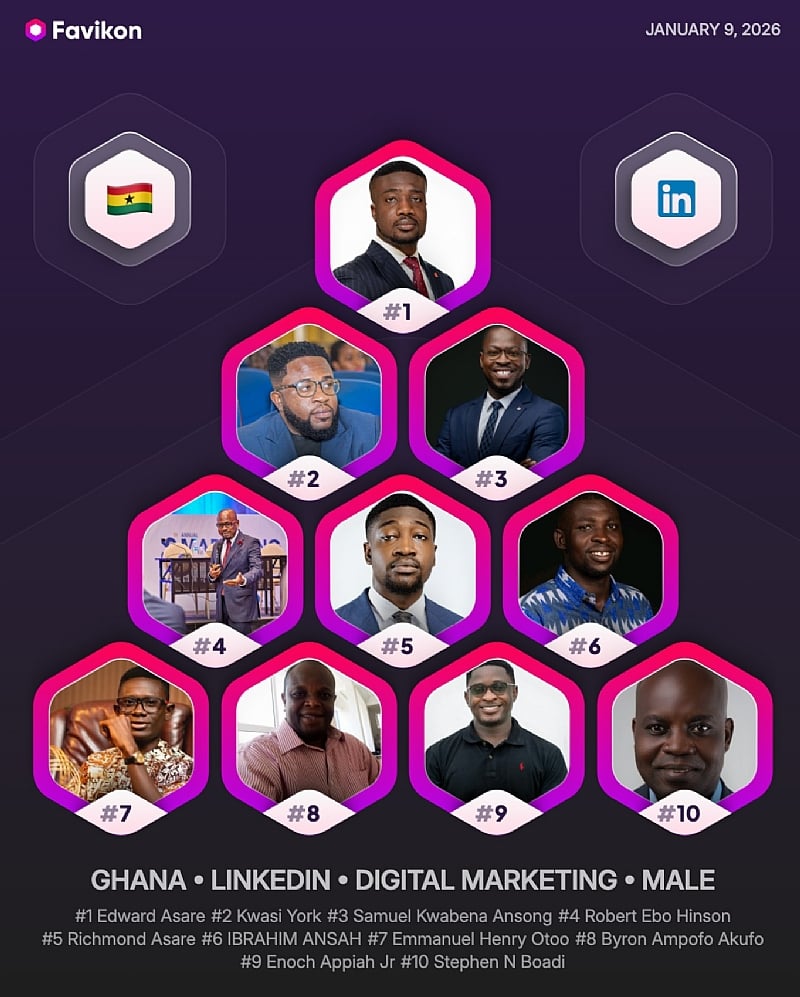 DIGITAL MARKETERS IN GHANA The digital marketing landscape in Ghana is thriving, with a growing number of professionals making their mark both locally and globally. In January 2026, Favikon released a ranking of Ghana’s top digital marketers on LinkedIn, highlighting the individuals leading the way in strategy, branding, and online influence. Whether you’re looking for inspiration, collaboration, or industry insights, these professionals represent the forefront of digital marketing in Ghana. Top 10 Digital Marketers in Ghana (January 2026) Here are the leading voices shaping Ghana’s digital space: Edward Asare – Digital Marketing Communications Expert and PR Specialist Rank: #1 in Ghana (Digital Marketing), #17 in Ghana (LinkedIn) Score: 86.9 Kwasi York – Digital Marketing Consultant & Personal Branding Expert Rank: #2 in Ghana (Digital Marketing), #36 in Ghana (LinkedIn) Score: 84.2 Samuel Kwabena Ansong – Digital Marketing Manager and Social Media Expert Rank: #5 in Ghana (Digital Marketing), #59 in Ghana (LinkedIn) Score: 79.6 Robert Ebo Hinson – Marketing “Pracademic” & Strategy Leader Rank: #4 in Ghana (Digital Marketing), #62 in Ghana (LinkedIn) Score: 79.4 Richmond Asare – IT Consultant and Brand Management Expert Rank: #5 in Ghana (Technology & Innovation), #100 in Ghana (LinkedIn) Score: Listed among top creators