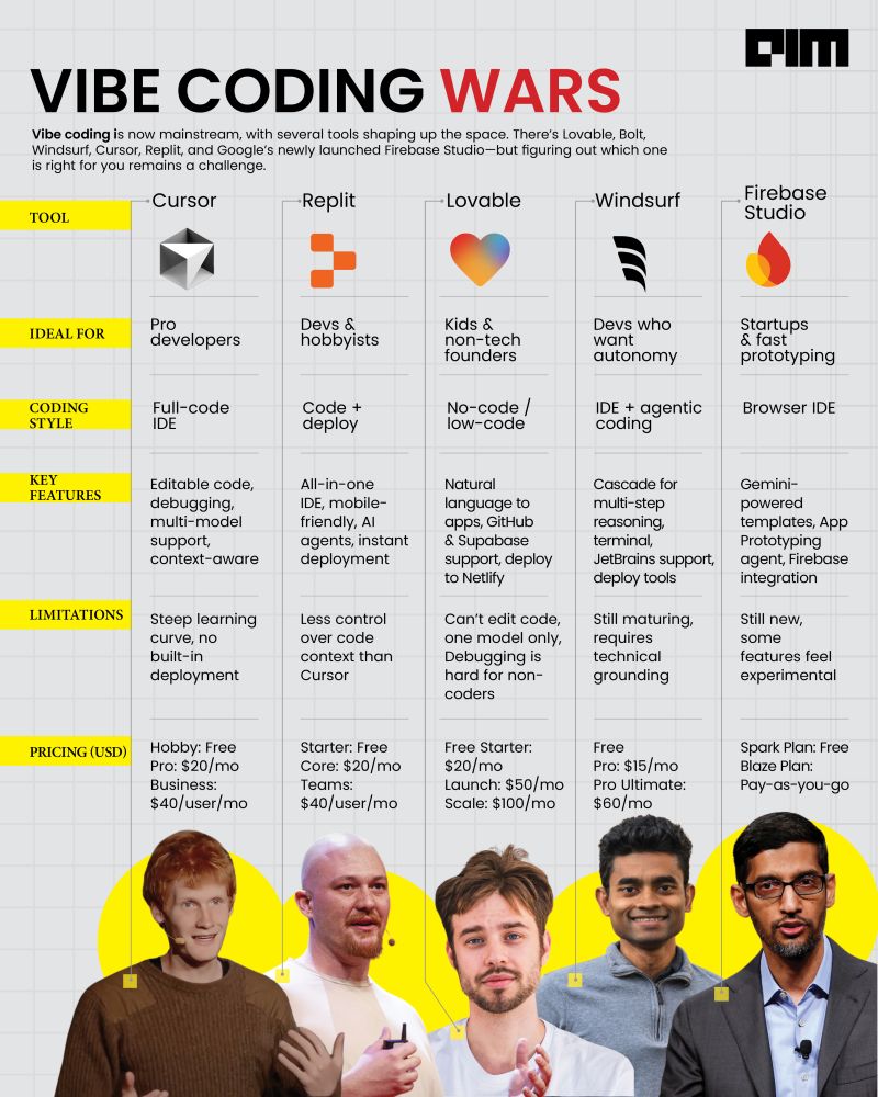 AIM’s Post Vibe coding has officially gone mainstream, with tools like Cursor, Replit, Lovable, Windsurf, and Google’s new Firebase Studio redefining how apps are built. “If you’re a non-technical person, you’ll be way ahead of your peers if you pick up a bit of coding and start fiddling with AI-driven coding environments,” said Paras Chopra, founder of Lossfunk. Cursor, the first breakout in the space, became known for its ‘Tab Tab Tab’ feature, offering natural language code generation, autocompletion, and a codebase-aware chatbot. While powerful, its lack of built-in deployment can make it intimidating for beginners. To bridge that gap, Replit has emerged as a go-to for end-to-end development and deployment. “Many vibe coders are switching from Cursor to Replit because we handle both development and deployment environments,” said Amjad Masad, Replit’s founder. From Reid Hoffman cloning LinkedIn with a single prompt to Kamal Haasan praising the platform, Replit’s reach goes beyond developers. Lovable, on the other hand, focuses on non-technical creators, turning natural language prompts into full-stack apps — a hit among kids and beginners. “Kids skipped break because they were vibe-coding too hard,” said founder Anton Osika. For those wanting more power, Windsurf offers an agentic coding partner