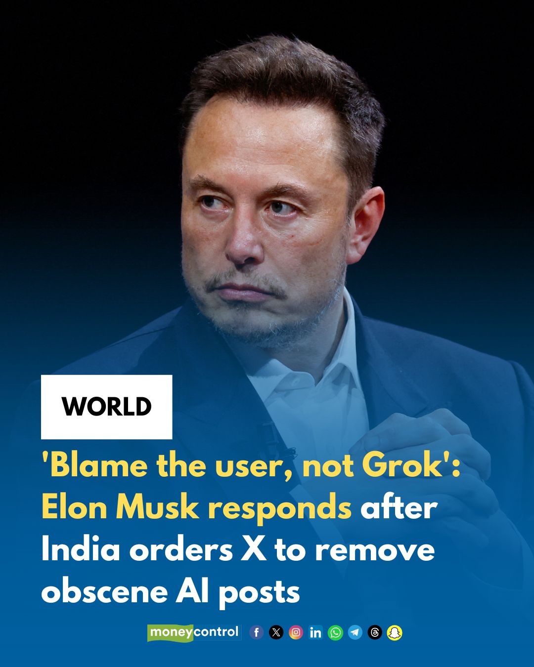 moneycontrol.com’s Post moneycontrol.com 1,289,904 followers 1h Edited #World | Microblogging site X owner Elon Musk on Saturday said people using the platform’s AI services Grok to make illegal content will face the same consequences as those uploading illegal content. 2 Comments Like Comment Shibendra Kumar Das 28m Lol how can India be in a position to direct Elon musk , when we know most of the talented Indians work in twitter /X….. Like Reply 1 Reaction moneycontrol.com 1h https://www.moneycontrol.com/news/india/blame-the-user-not-grok-elon-musk-responds-after-india-orders-x-to-remove-obscene-ai-posts-13755477.html Like Reply 1 Reaction See more comments To view or add a comment, sign in 1,289,904 followers View Profile Follow More from this author MC Tech3 | Deepinder doubles down as gig economy divides Internet; India drafts space traffic safety rules; and more moneycontrol.com 1d ITC under pressure, China silver worries, and Bollywood starts strong in 2026 — Editor’s Picks from Moneycontrol moneycontrol.com 1d Relief to Vodafone Idea, gig workers on strike, and this year’s markets scorecard – Editor’s Picks from Moneycontrol moneycontrol.com 3d Explore content categories Career Productivity Finance Soft Skills & Emotional Intelligence Project Management Education Technology Leadership Ecommerce User Experience
